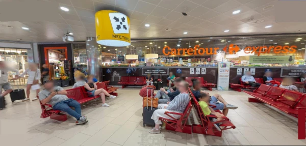 - di fronte al SUPERMERCATO CARREFOUR trovi un area delimitata dal cartello circolare giallo “Meeting point” appeso al soffitto (vedi foto)