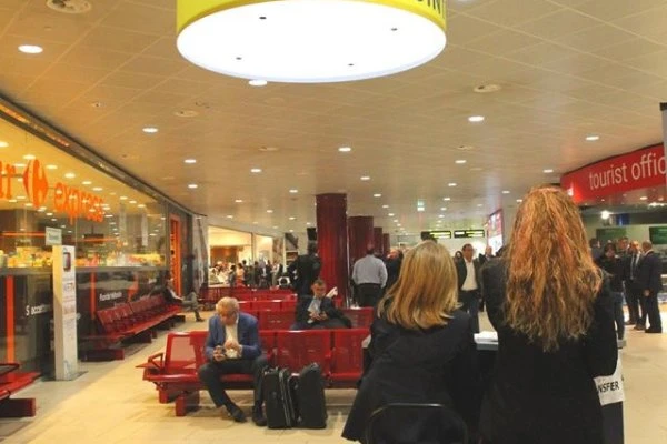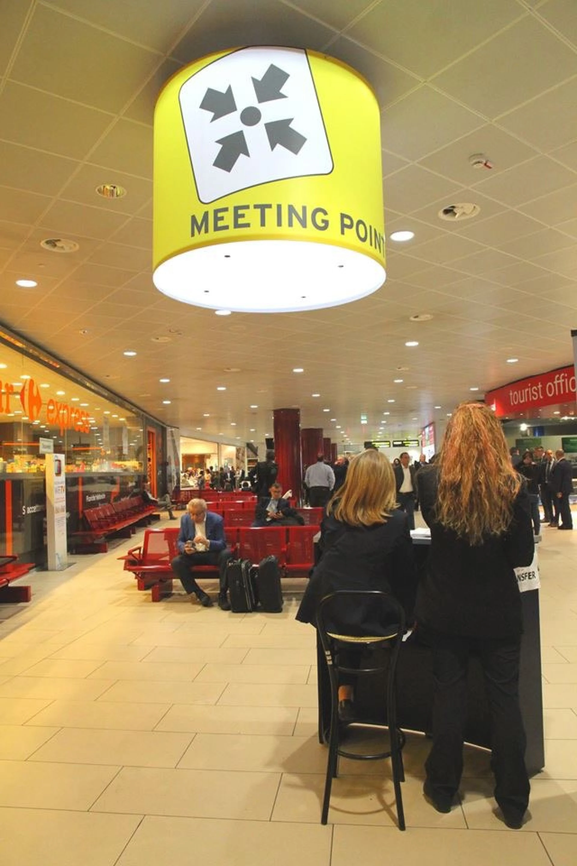 - di fronte al SUPERMERCATO CARREFOUR trovi un area delimitata dal cartello circolare giallo “Meeting point” appeso al soffitto