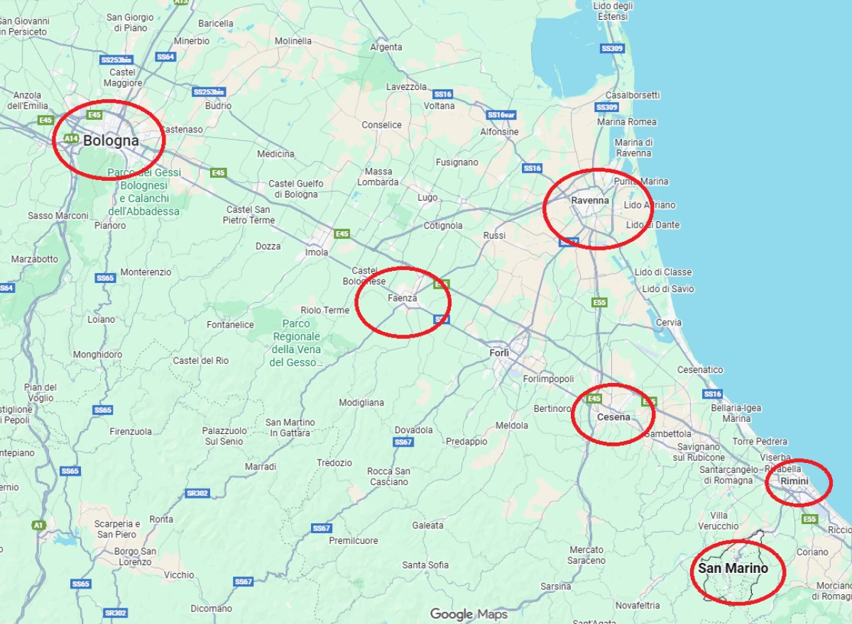 Ravenna, Faenza, Cesena, Rimini, Bologna e relative province, inclusi aeroporti, porti crocieristici, stazioni ferroviarie, hotel, aziende ed eventi.